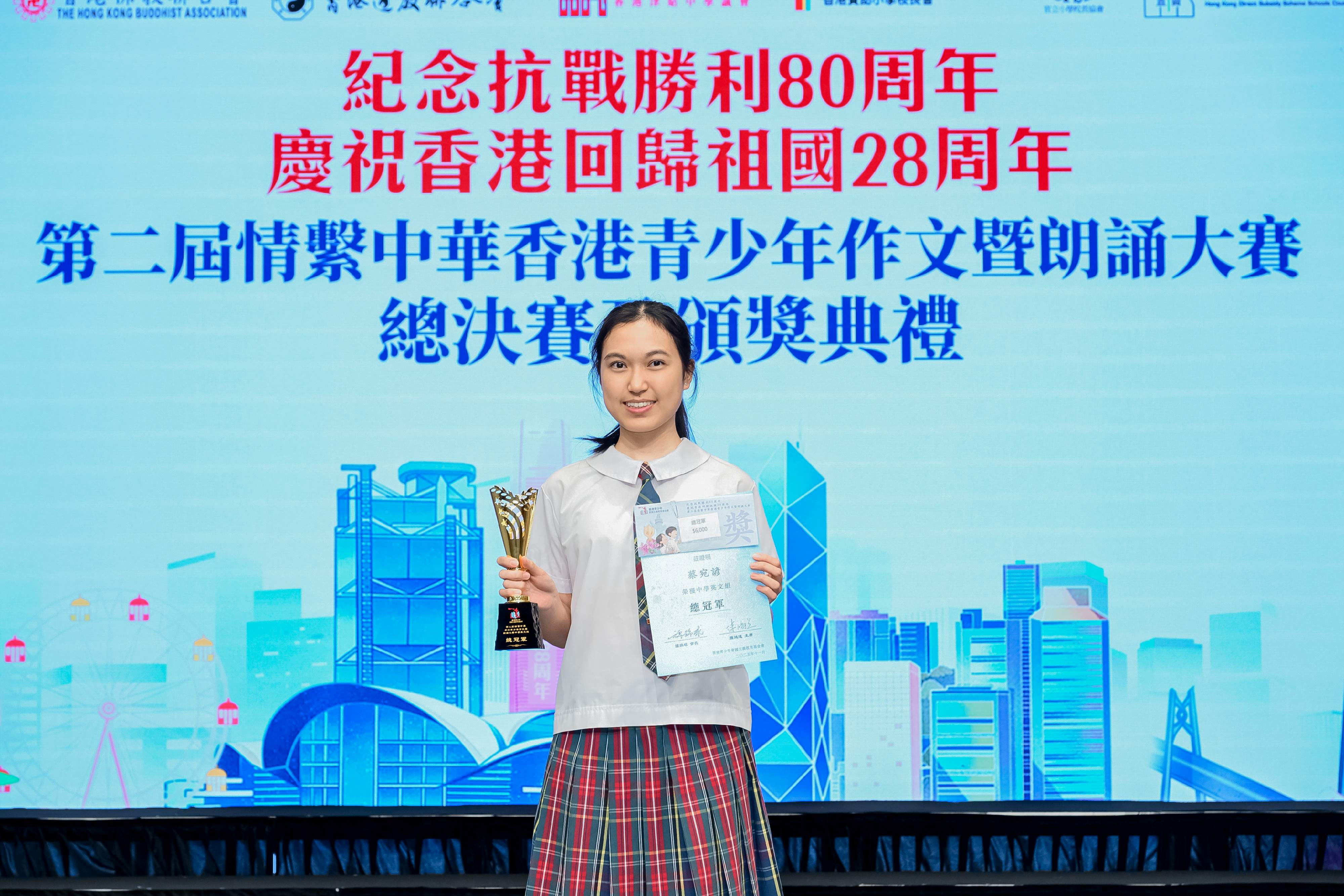 教育局局長蔡若蓮博士在致辭中表示,同學以文字和聲音表達對香港和祖國的祝福,展現對中華文化的熱愛,以及對國家發展的憧憬和承擔。今年適逢抗戰勝利80周年,銘記歷史、緬懷先烈,教育局非常重視愛國主義教育,尤其希望年青一代學好歷史,樹立正確的國家觀念。教育局持續以「多重進路、互相配合」的方式,讓愛國主義教育融入日常學與教,厚植家國情懷。