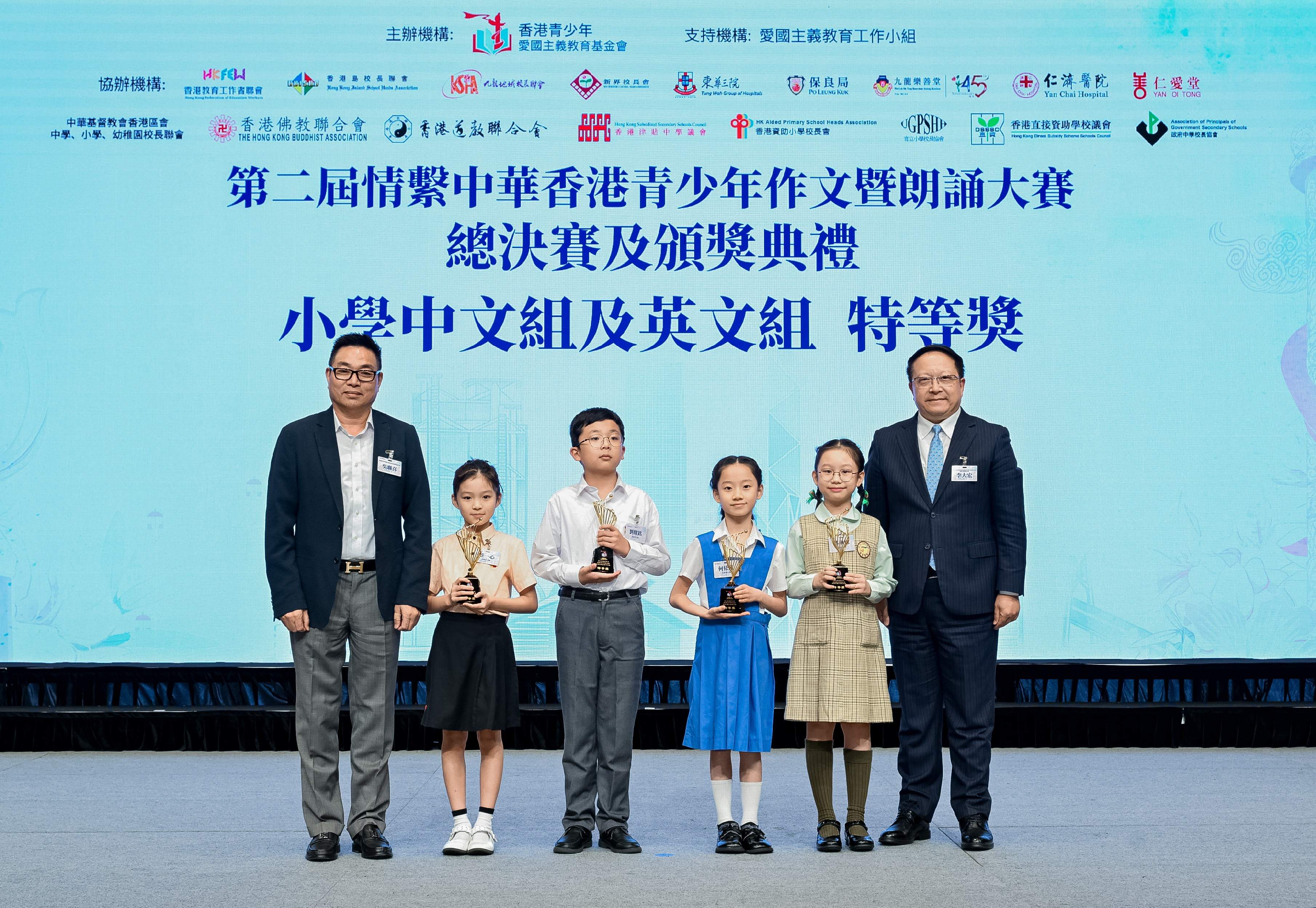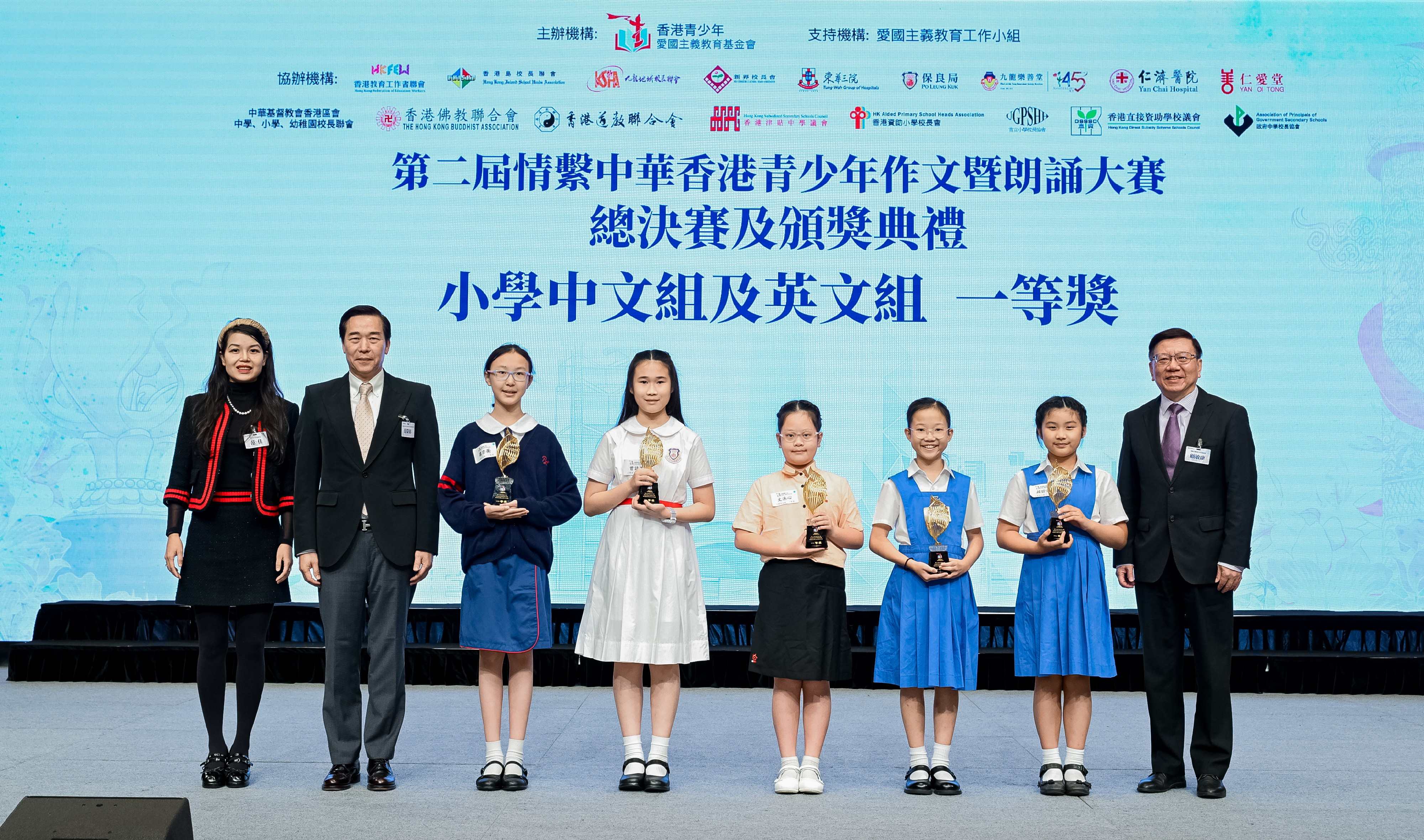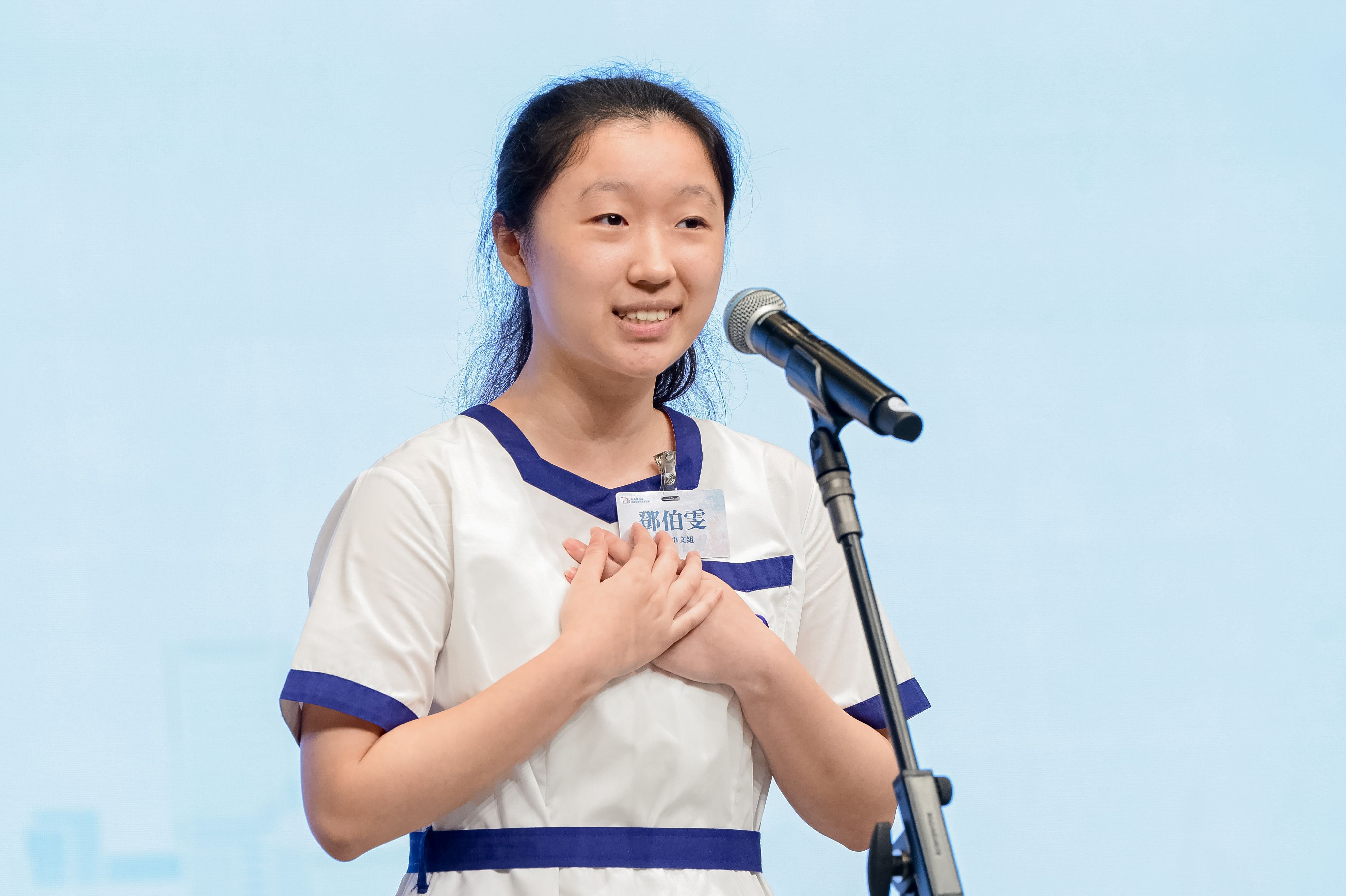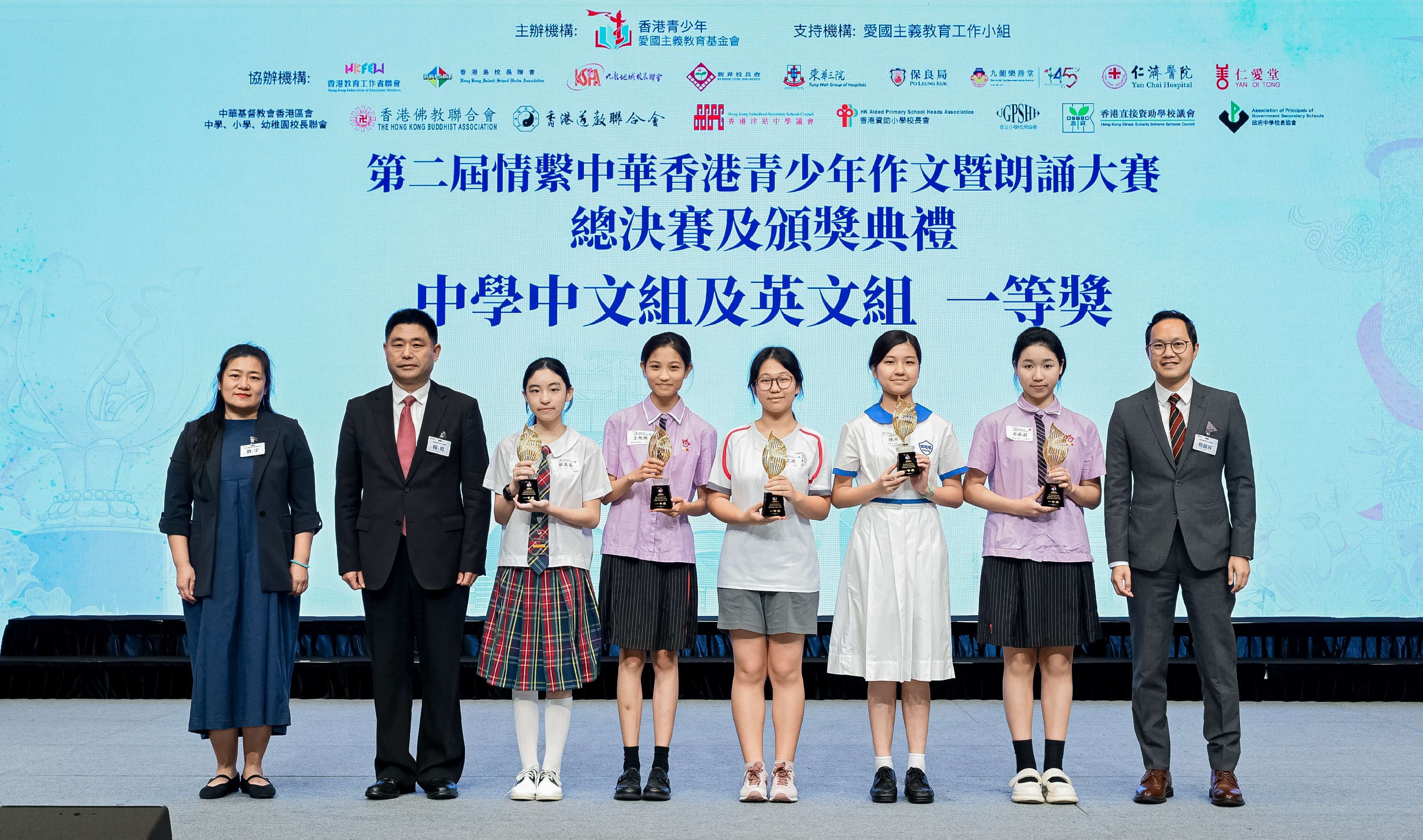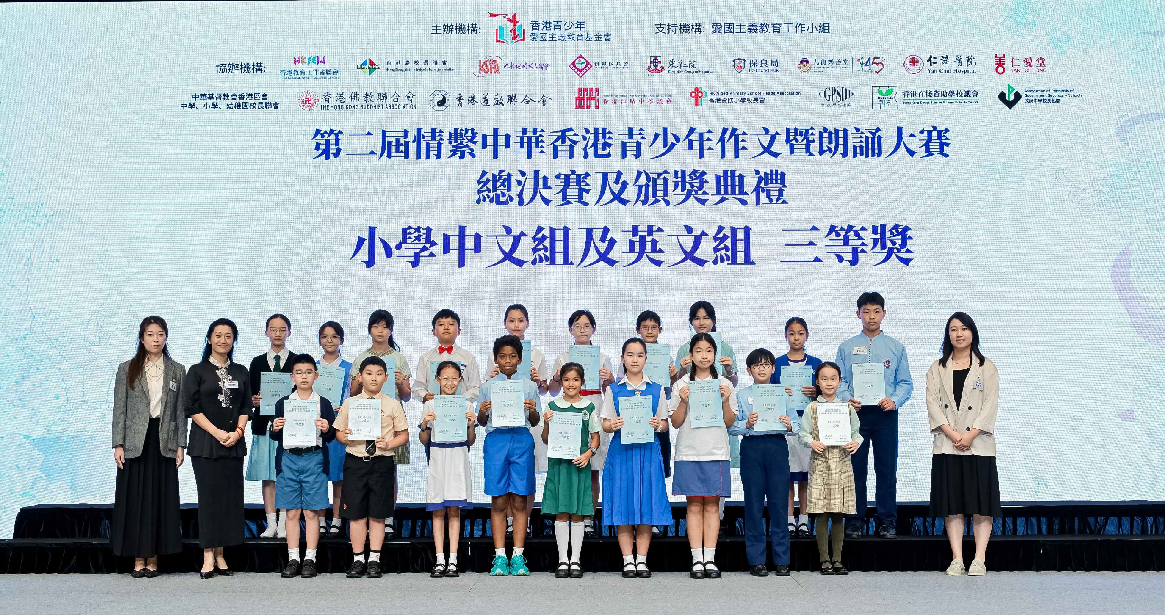 總決賽現場,參賽學生以真摯情感與青春視角,抒發對祖國的熱愛之情,情真意切,令人動容。最終,來自嘉諾撒小學(新蒲崗)的張梓琳、聖保羅男女中學附屬小學的馮靖霖、拔萃女書院的鄧伯雯以及聖保祿學校的蔡宛諺分別獲得各組別總冠軍。此次大賽還設有特等獎(8名)、一等獎(11名)、二等獎(46名)、三等獎(50名)、優秀獎(51名)。頒獎禮上,主禮嘉賓及基金會首長為獲獎同學頒發獎盃及證書。