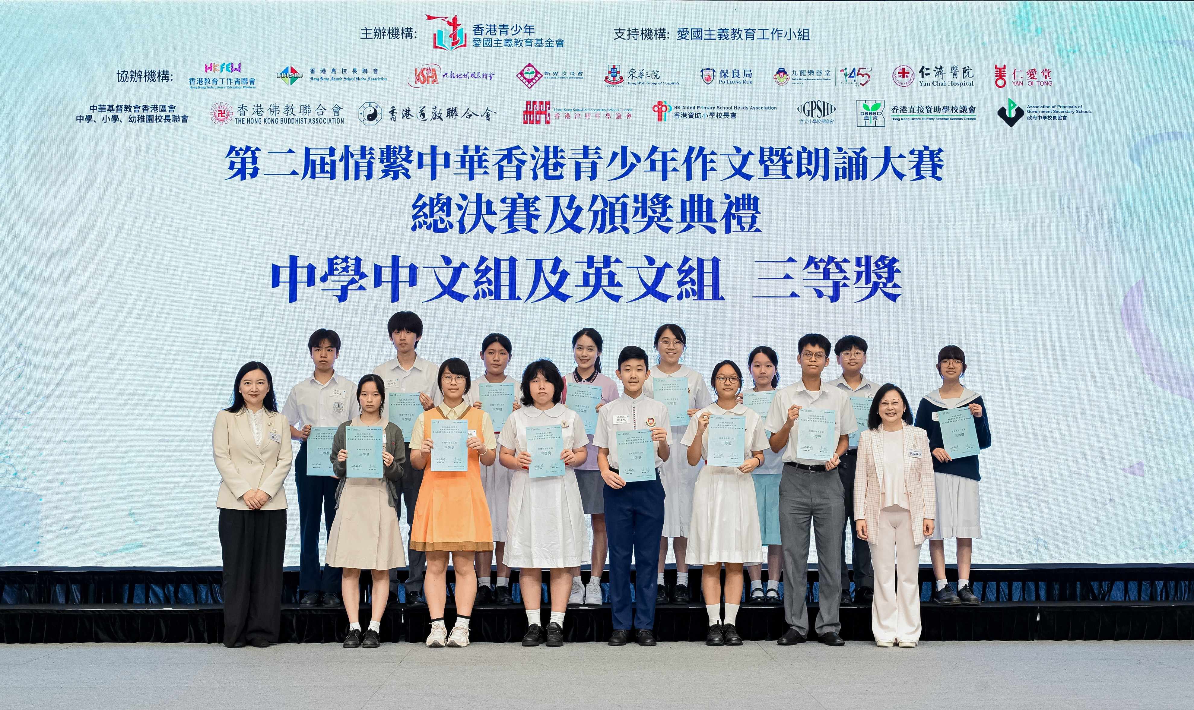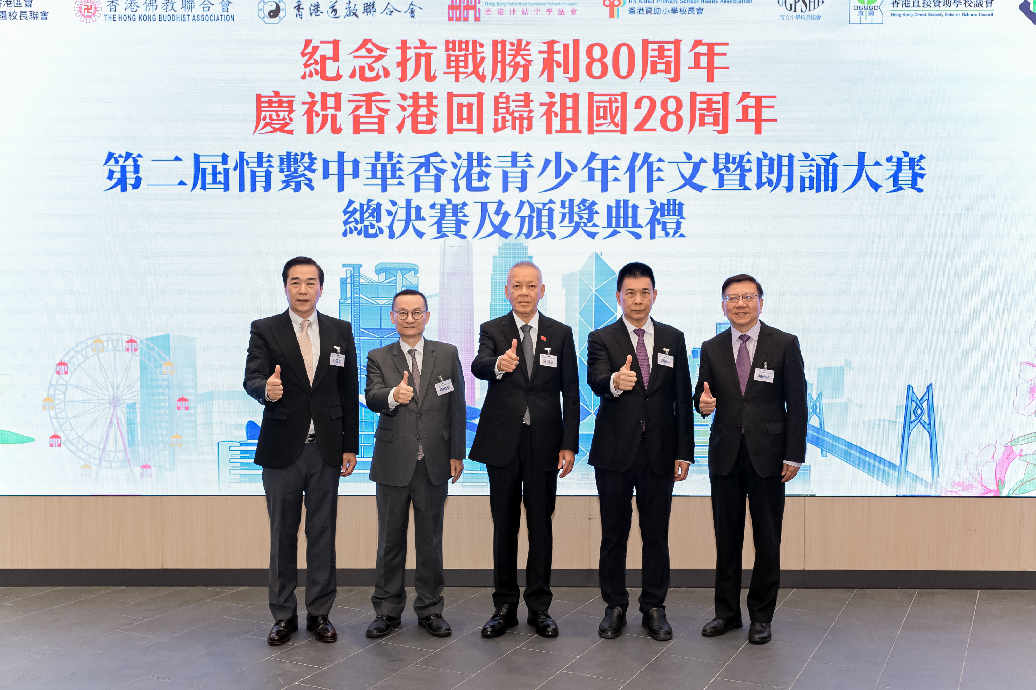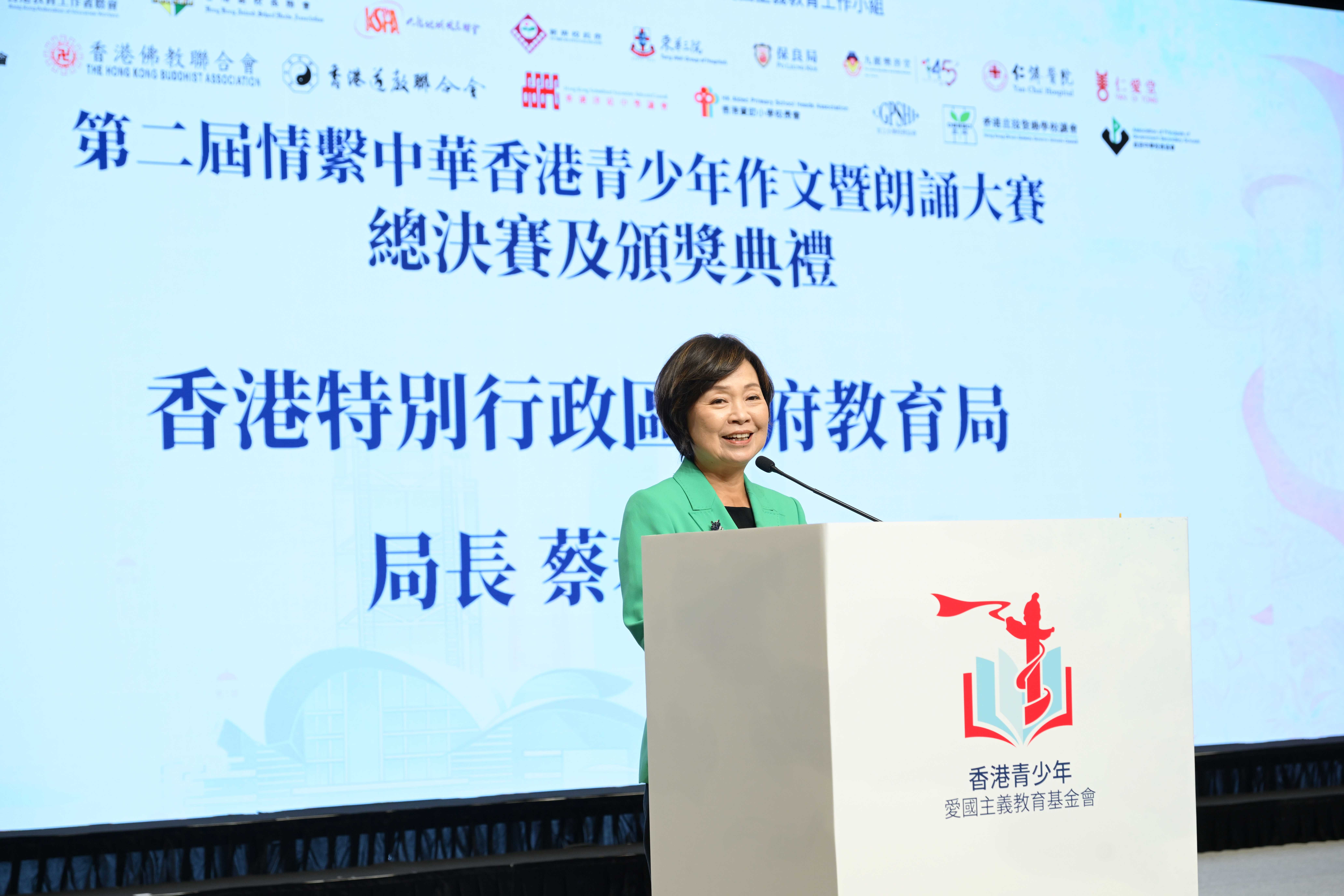 教育局局長蔡若蓮博士在致辭中表示,同學以文字和聲音表達對香港和祖國的祝福,展現對中華文化的熱愛,以及對國家發展的憧憬和承擔。今年適逢抗戰勝利80周年,銘記歷史、緬懷先烈,教育局非常重視愛國主義教育,尤其希望年青一代學好歷史,樹立正確的國家觀念。教育局持續以「多重進路、互相配合」的方式,讓愛國主義教育融入日常學與教,厚植家國情懷。