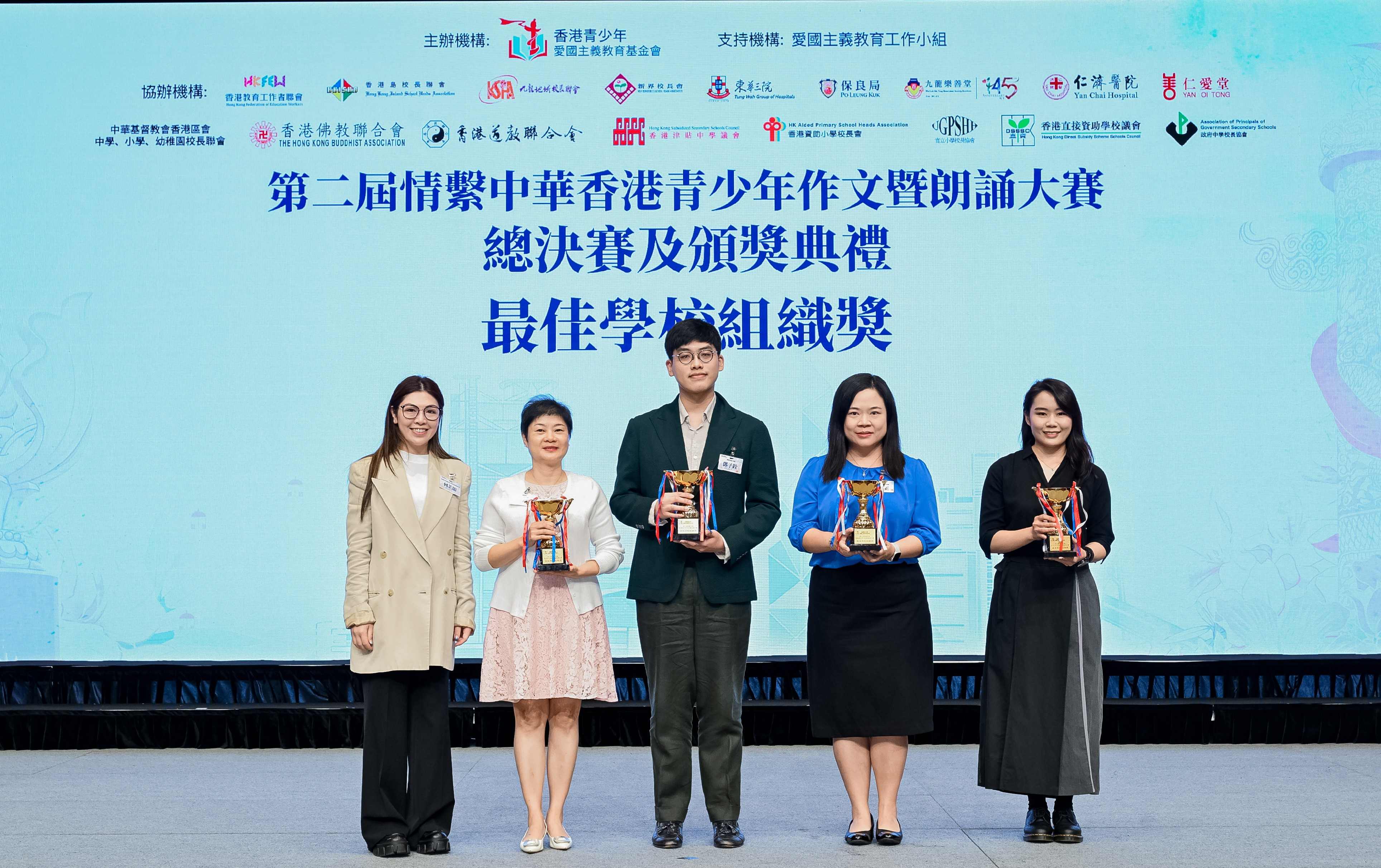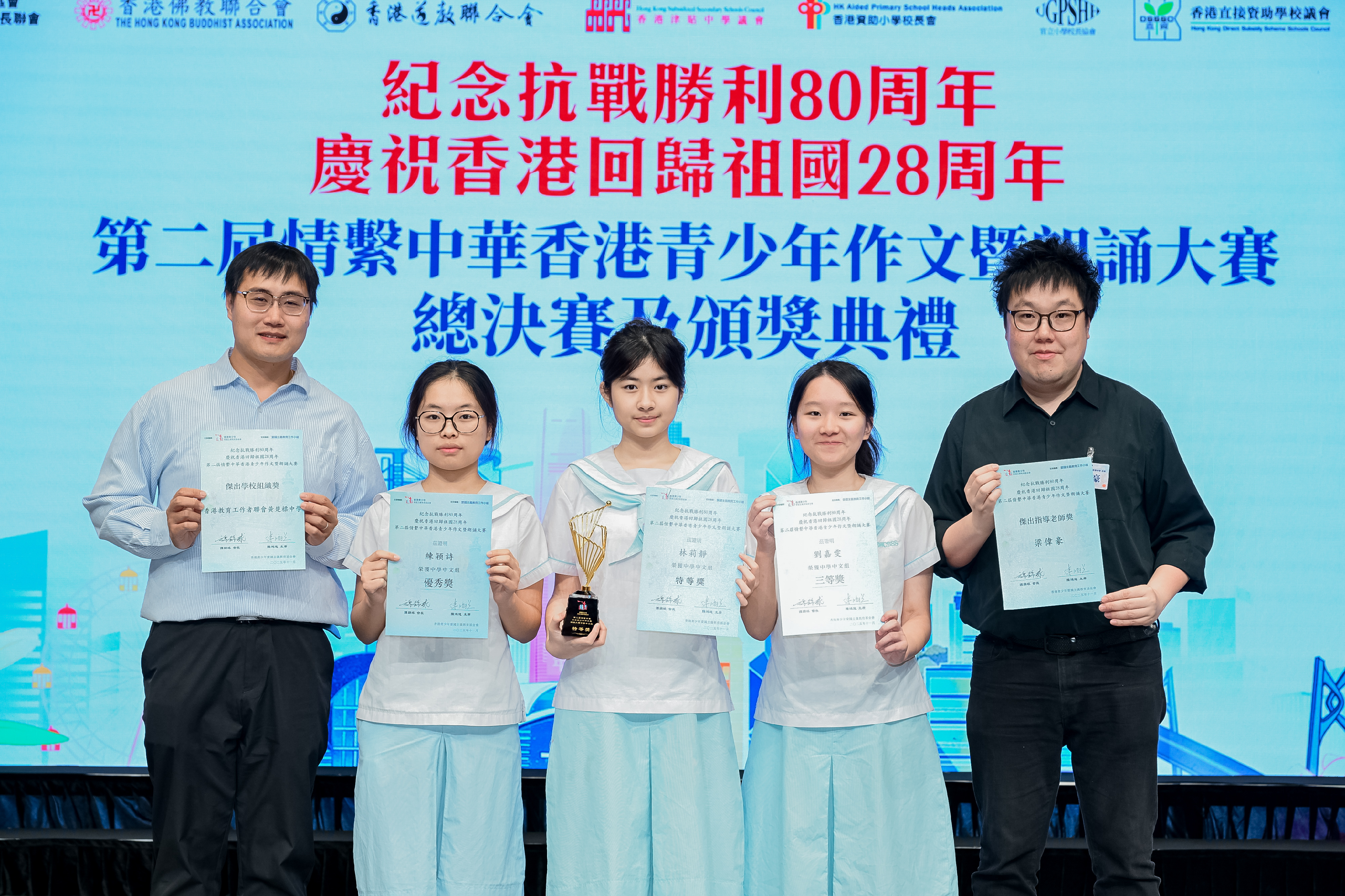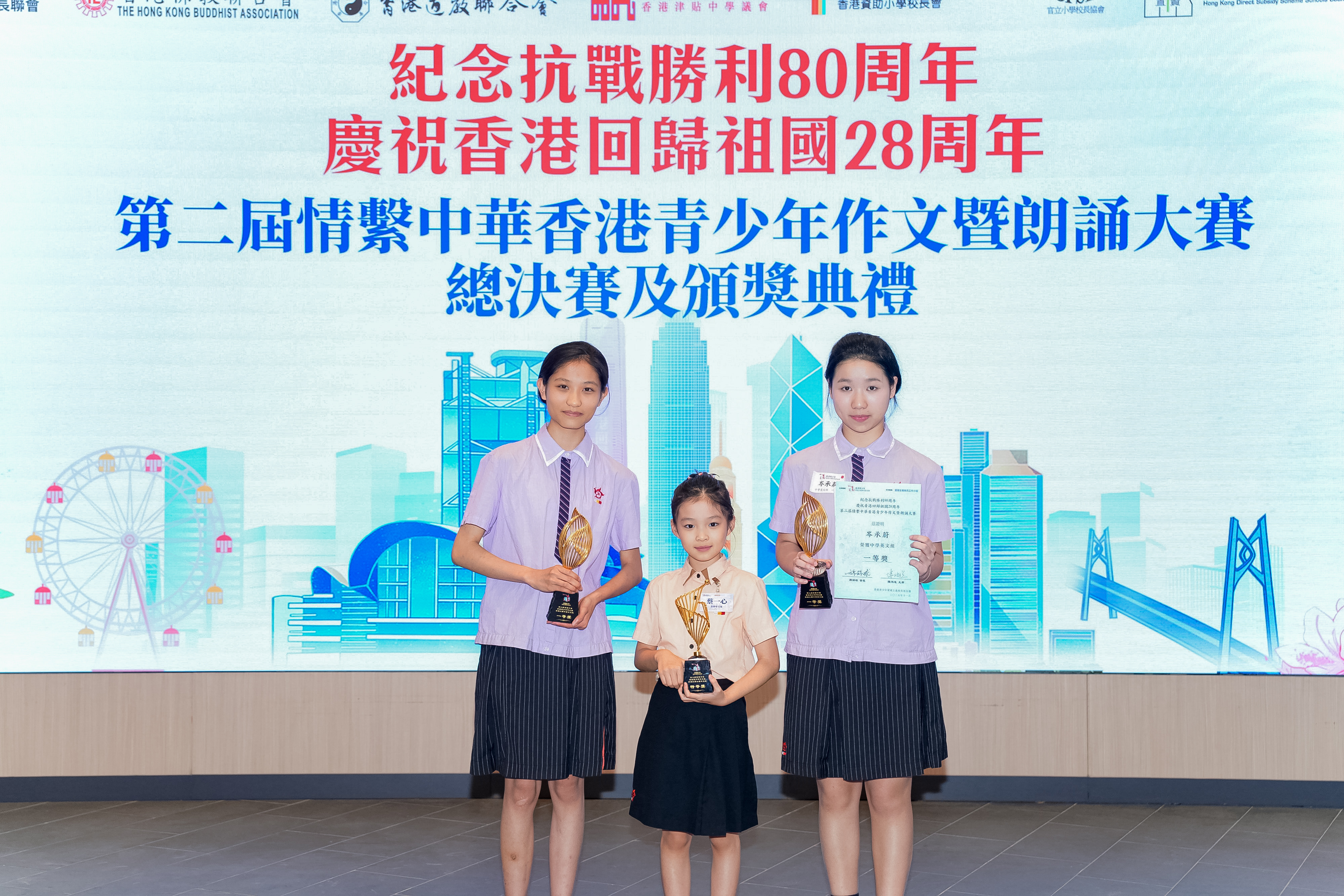 總決賽現場,參賽學生以真摯情感與青春視角,抒發對祖國的熱愛之情,情真意切,令人動容。最終,來自嘉諾撒小學(新蒲崗)的張梓琳、聖保羅男女中學附屬小學的馮靖霖、拔萃女書院的鄧伯雯以及聖保祿學校的蔡宛諺分別獲得各組別總冠軍。此次大賽還設有特等獎(8名)、一等獎(11名)、二等獎(46名)、三等獎(50名)、優秀獎(51名)。頒獎禮上,主禮嘉賓及基金會首長為獲獎同學頒發獎盃及證書。