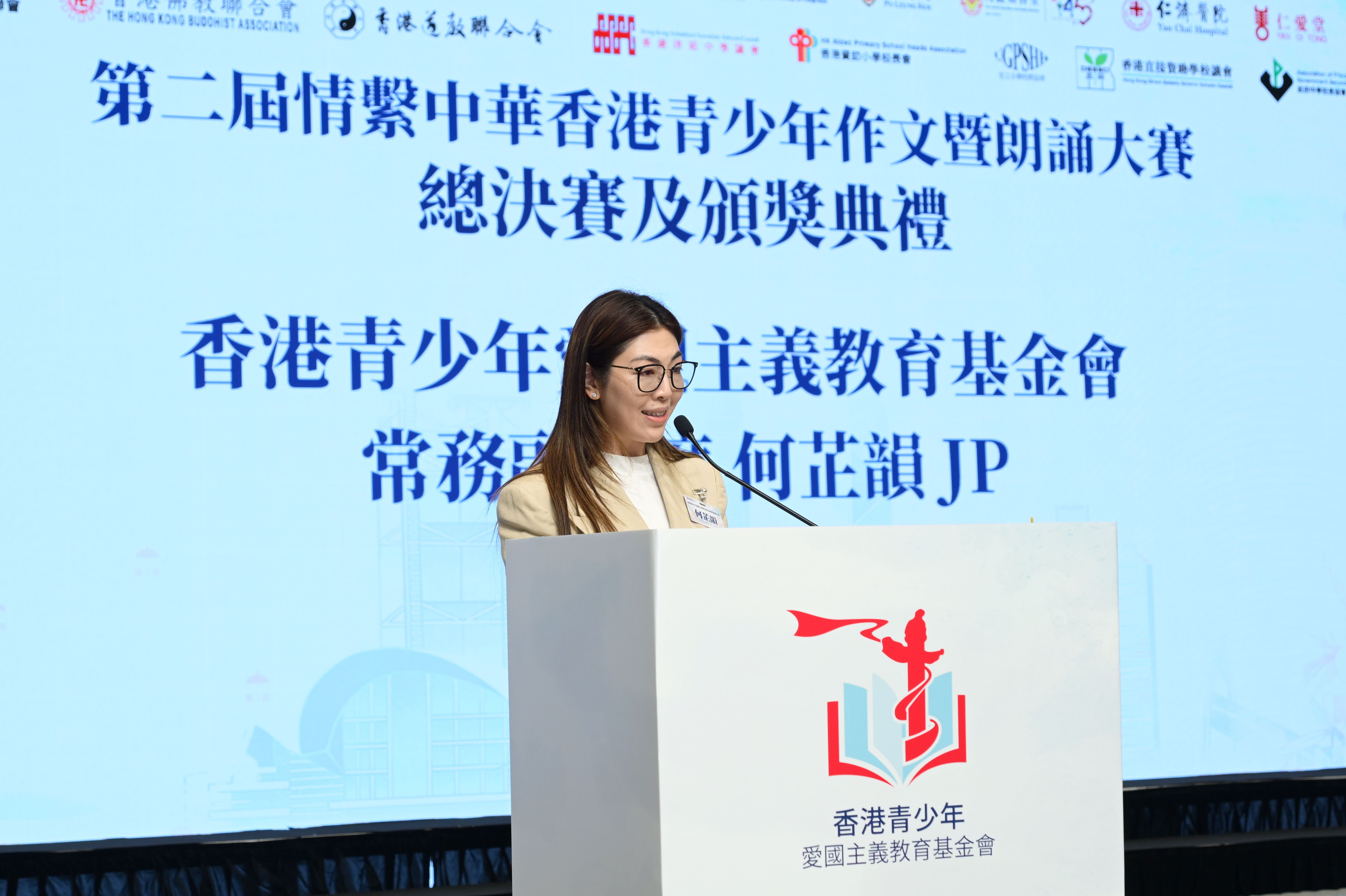 基金會常務副主席何芷韻發表謝辭,感謝所有出席嘉賓及評判,感謝支持機構和協辦機構,學校、家長、同學們和媒體朋友對本次活動的大力支持和參與。她表示通過本次大賽,欣喜地看到同學們展現的不僅是才華橫溢的文采,更是字裏行間那份深沉的家國情懷與堅定的責任擔當。未來,基金會將陪伴更多香港青少年認識國家、貢獻社會、擁抱時代。