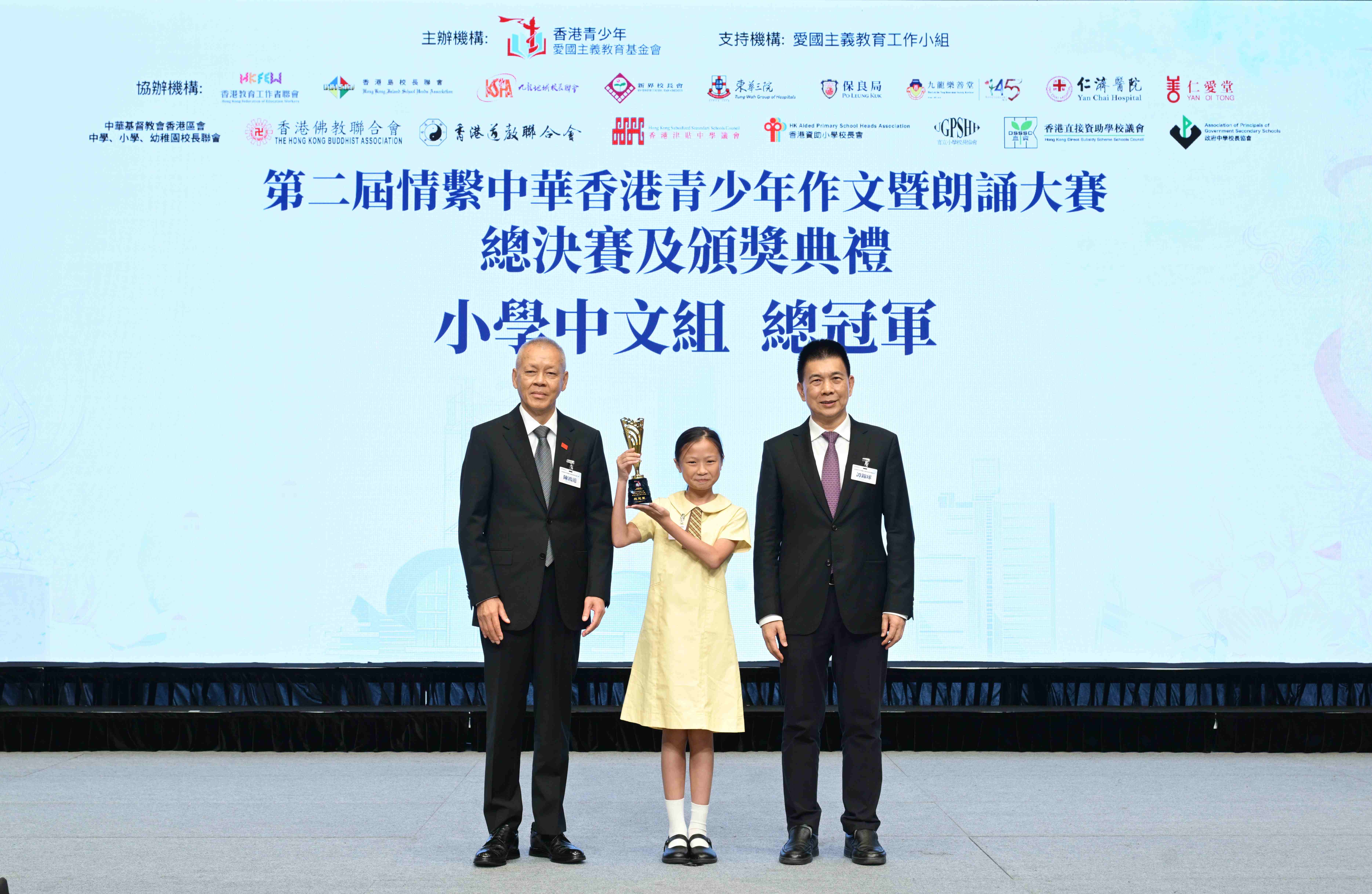 譚錦球及陳鴻道向小學中文組總冠軍張梓琳頒發獎盃
